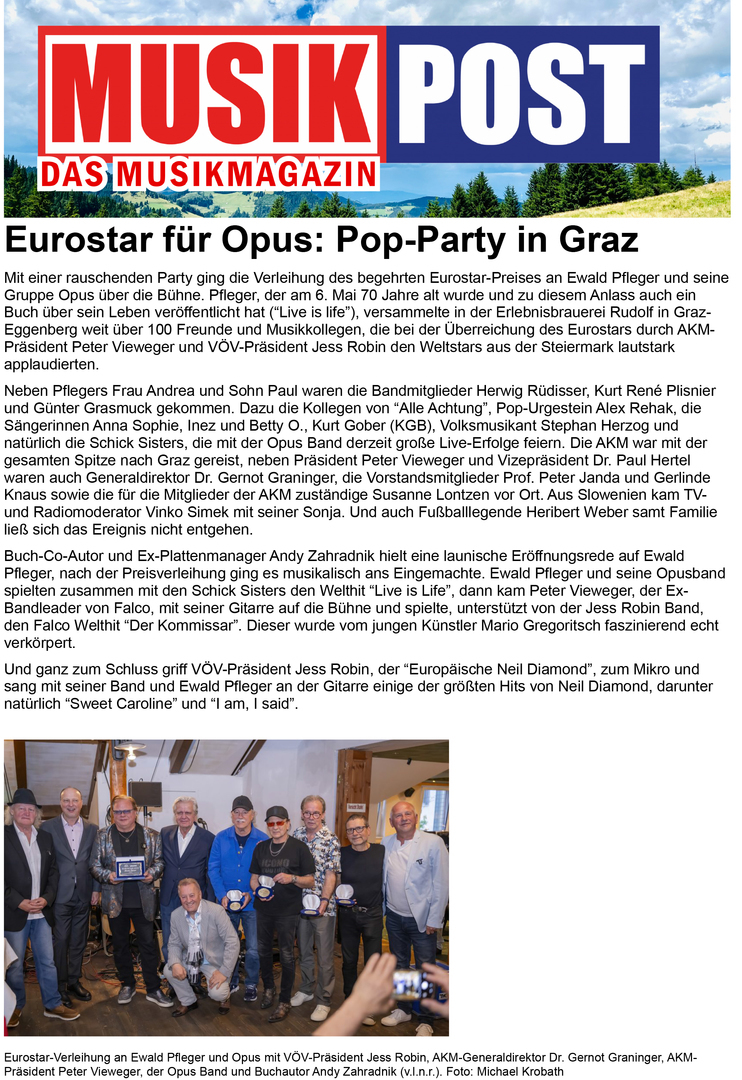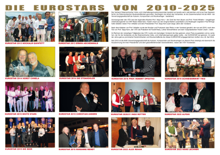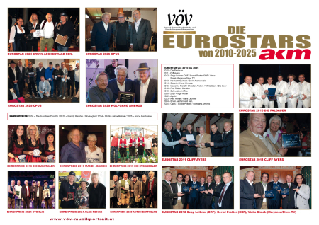 Zahlreiche Ehrengäste waren eingetroffen um dieser würdigen Feier in der Erlebnisbrauerei Rudolf in Graz beizuwohnen. So lauschten der Ansprache von VÖV-Präsidenten Jess Robin, dem Moderator des Abends ORF-Urgestein Leo Walch aus Oberösterreich, den Laudatoren Walter Reischl, Hubert Urach, Fritz Willingshofer und AKM Direktor Kurt Wieser, neben aufmerksamen Gästen unter anderen auch die Willingshofer Brüder Reinhard und Hans, Sulmtaler Legende Karl Christandl, Bernd Reischl, Karl Haider (Reisebüro Hakali), David Ritt (Ritt Sound), Lothar Schwertführer (VÖV Vorstand und Journalist), Bauernbund Dir. Franz Tonner, Robby Musenbichler, der 90 jährige slowenische Schauspieler Demeter Bitenc (drehte mit Liz Taylor und Richard Burton), Hausherr Rudolf Mally der mit seinen Gastroboys musizierte und Paldauer Bandleader Franz Griesbacher der als im Vorjahr mit dem Eurostar Ausgezeichneter, die Überreichung der „Eurostars“ übernahm.